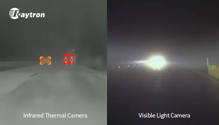 - Nighttime & Low Light: Traditional headlights provide approximately 100–150 meters of illumination, while Raytron’s car thermal camera can detect objects up to 300 meters away at night. This extends crucial reaction time for drivers, especially on unlit highways and rural roads.